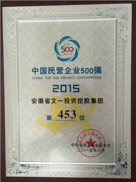 2015年8月25日,由全国工商联主办的2015中国民营企业500强新闻发布会在京召开。全国政协副主席、全国工商联主席王钦敏出席并发布榜单,全国工商联副主席安七一出席发布会,发布会由全国工商联副主席黄荣主持。此次新闻发布会公布的2015中国民营企业500强榜单中,文一集团位列第453位,成为上榜三家皖籍企业之一。