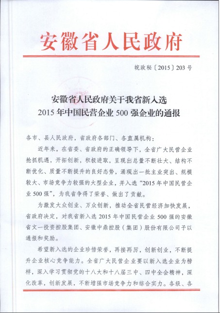 安徽省人民政府下文通报和奖励文一集团入围全国民营企业500强