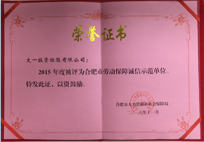 2016年12月,经合肥市人力资源和社会保障局评选,文一集团在众多企业中脱颖而出,荣获 2015年度“合肥市劳动保障诚信示范单位”称号。