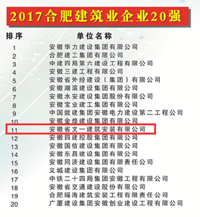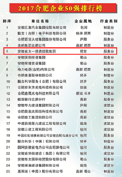 10月17日,2017合肥企业50强发布暨工业经济形势报告会在市政务会议中心召开。文一投资控股集团以264.48亿元的营业收入位列合肥企业50强榜单第5位、合肥服务业企业20强榜单第2位,文一建筑安装有限公司位列合肥建筑业企业20强榜单第11位。至此,文一集团已连续多年获得上述荣誉。