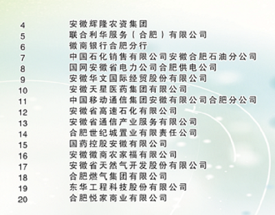 2017 合肥企业50强是由合肥市经信委、合肥市企业联合会共同发布的合肥地区大企业榜单。近年来,合肥市企业50强入围门槛显著提高,本次发布入围标准是2016年企业营业收入不低于20亿元。入选此份榜单第50位的企业营业收入为20.72亿元,比上一年第50位提高1885万元。50强企业的营业收入为5261亿元,比上年增长6.9%;纳税211.74亿元,比上年增长12.2%;利润243.08亿元,比上年增长6.1%。户均营业收入105亿元、纳税4.23亿元、利润4.86亿元。