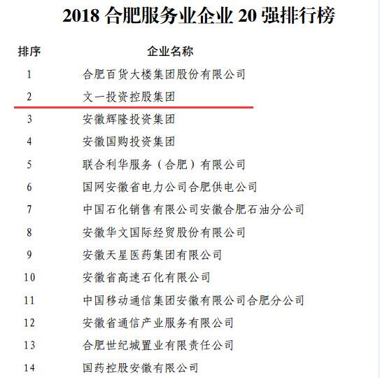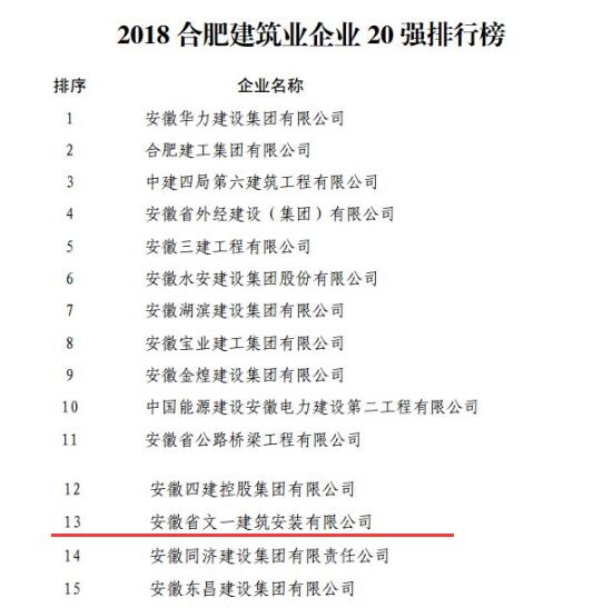 9月11日,2018合肥企业50强新闻发布会在市政务中心举行,文一投资控股集团以301.19亿元营业收入排名合肥企业50强第5位、合肥服务业企业20强第2位,盈利水平居全市第2位。文一建筑安装有限公司位列合肥建筑业企业20强第13位。