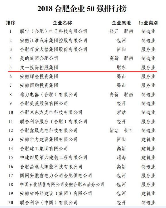 以上排序依据为企业2017年度营业收入,今年已是第十次发布。入选企业总体保持了总量增、效益升、创新好且稳中有进的发展态势。其中,前十强企业营业收入、利润、纳税分别占50强总量的53.9%、36.1%、41.5%,充分发挥了全市企业排头兵、经济发展主引擎的作用。其中,文一投资控股集团2017年纳税总额近20亿元,居安徽民企首位。