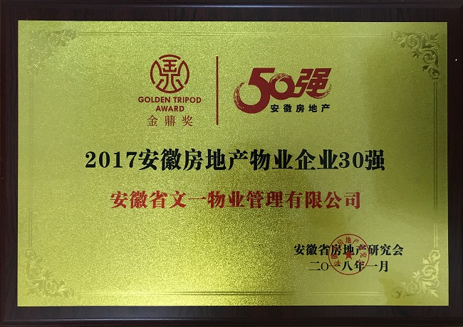 1月8日,安徽省2018年房地产市场形势分析会暨2017年度安徽地产50强榜单发布会在合肥举行。在2017年度安徽房地产50强及十大社会责任企业榜单中,文一房地产集团均荣登首位,旗下文一·豪门金地、文一·塘溪津门获评2017安徽房地产人居经典典范楼盘。此外,文一物业入围2017安徽物业企业30强。
