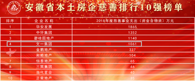 回顾过去的2018年,面对严峻的市场环境、经济下行加剧等诸多压力与挑战,文一人不惧风雨、同心聚力,深入推进人才队伍、体制机制、战略布局等改革创新,先后荣登中国民营企业500强第247位、蝉联安徽民营企业纳税百强第1位、营收百强第2位,连续八年荣膺安徽省民营企业10强,排名中国民企服务业100强第65位,成为安徽唯一入榜企业。企业发展壮大的同时,文一积极投身扶贫攻坚,带动数万人就业,大力支持文体教育事业发展,持续开展品质升级工程,切实关爱弱势群体,多维度践行企业社会责任。