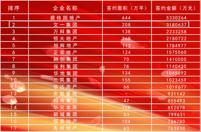4月17日,2018年度安徽省房地产企业排行榜于合肥发布。文一集团荣登安徽本土房企销售排名20强(全国项目)首位,位居安徽省房企销售排名50强(安徽项目)第二位,排名安徽省本土房企慈善榜第四位。