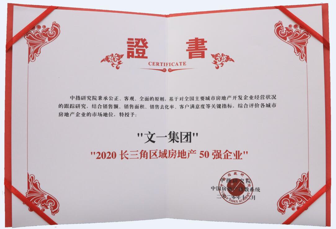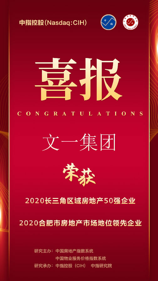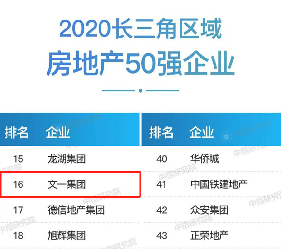 【文一集团】荣登2020长三角区域房地产50强企业第16位 居安徽本土房企之首