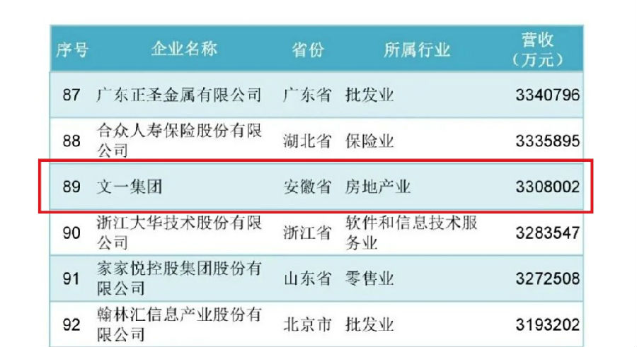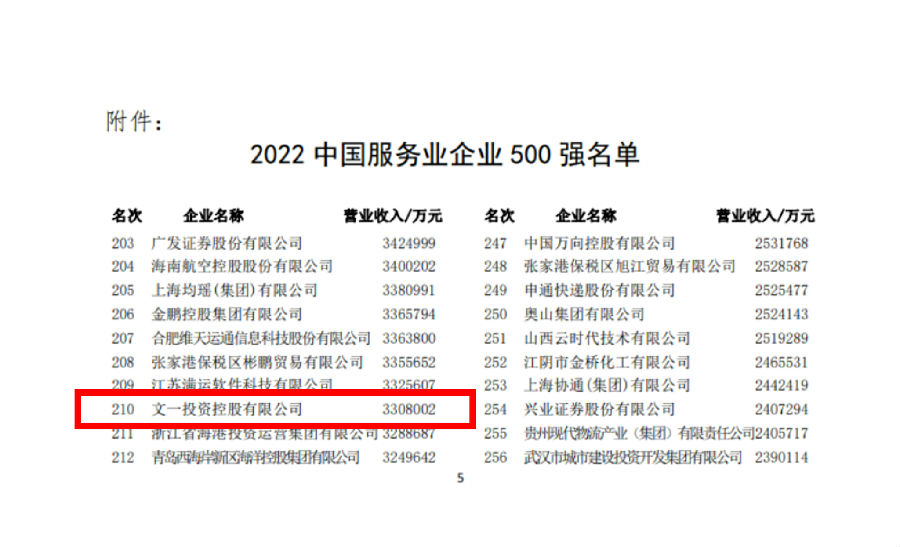 与此同时,中国企业联合会、中国企业家协会9月6日发布的中国服务业企业500强榜单中,文一集团上榜中国服务业企业500强第210位。