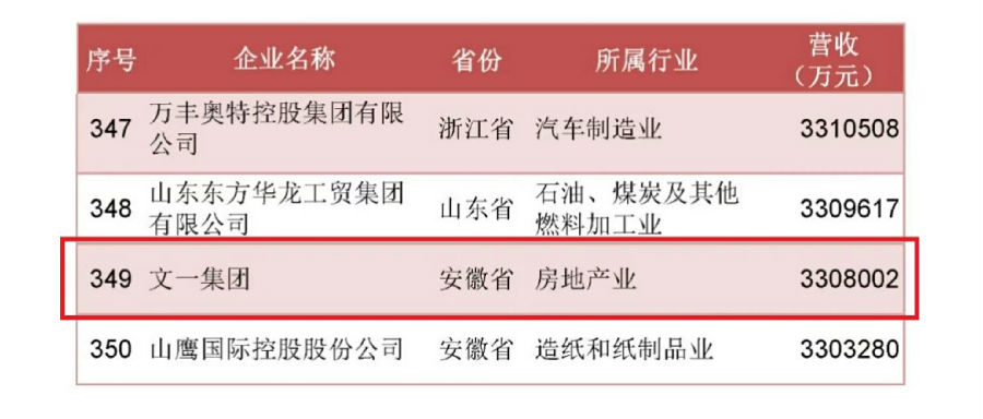 文一集团位列2022中国民营企业500强榜单第349位