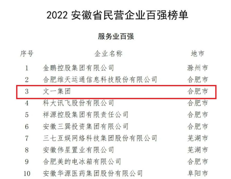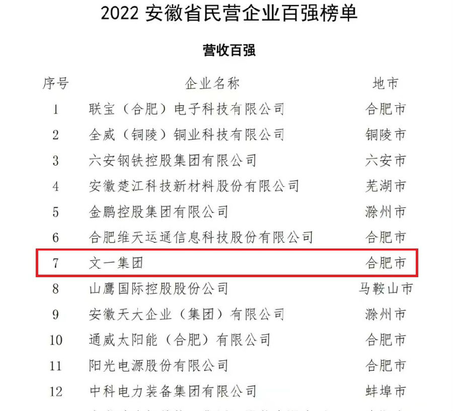 9月20日,2022世界制造业大会——中国民营制造业合作交流对接会在合肥举行。会上发布了2022安徽省民营企业营收百强、制造业综合百强和服务业百强榜单,文一集团荣登2022安徽省民营企业服务业百强第3位、营收百强第7位。