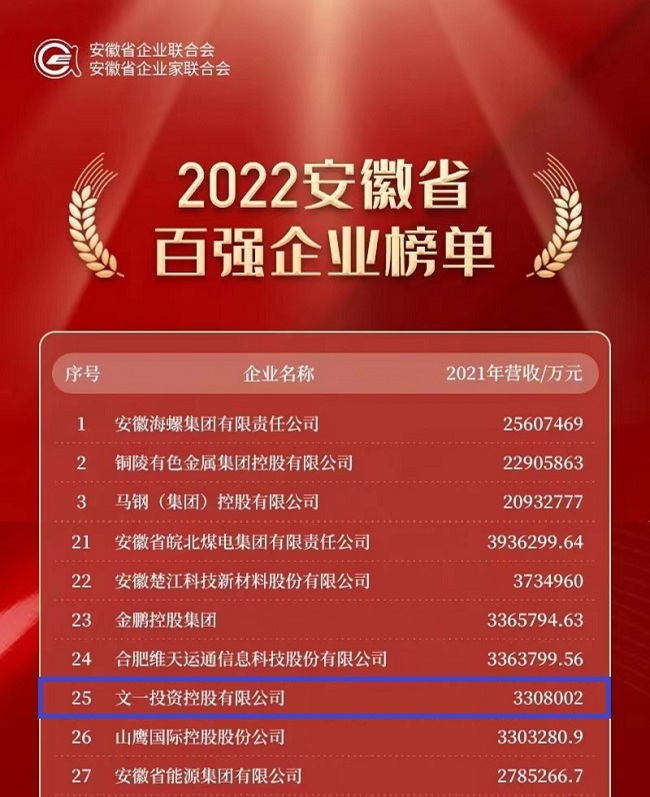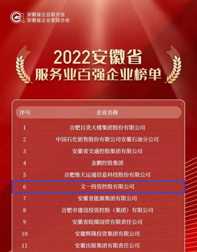 据悉,本次是安徽企联第18次向社会公开发布安徽百强企业榜单,旨在引导我省企业特别是大企业在新发展格局中展现更大担当,实现更大作为,积极推动我省大企业争做中国式现代化和我省“三地一区”建设的主力军,进一步推动安徽省市场经济高质量发展。文一集团此次荣登2022安徽省企业百强、服务业百强两大榜单,是企业长远布局、稳健发展的实力验证,更是其积极参与美好安徽建设的决心验证。