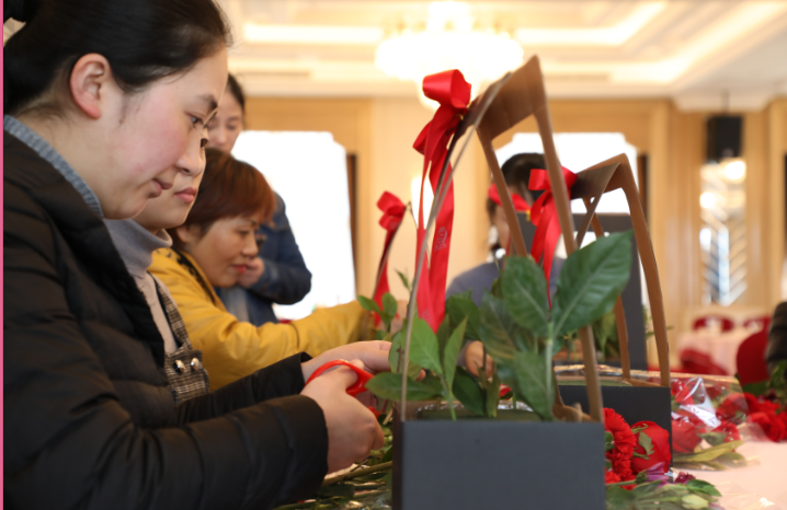 简单休息后,游艺活动进入第二项——插花比赛。活动现场,花艺师从修剪、选花搭配、造型设计等方面进行了详细的讲解,强调了插花的操作技巧和注意要领,并进行现场插花演示互动。女员工们兴趣盎然,在花艺师的指导下,发挥创造力,施展插花技能,将原本普普通通的花草修剪,再根据不同的色彩搭配,整合造型,插出了漂亮美丽的花,为节日增添了一道亮丽的风景线。完成插花以后,每队选出自己队伍里最美丽的花篮交由插花老师评比。最终第5队、第1队、第3队分获插花比赛前三名。