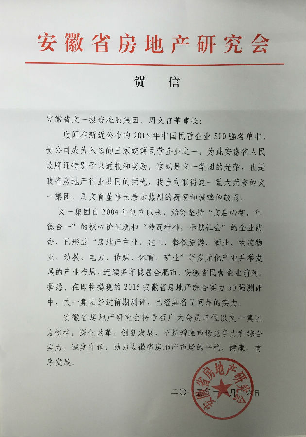 11月16日,安徽省房地产研究会向文一集团发来贺信,祝贺文一集团入选2015年中国民营企业500强。