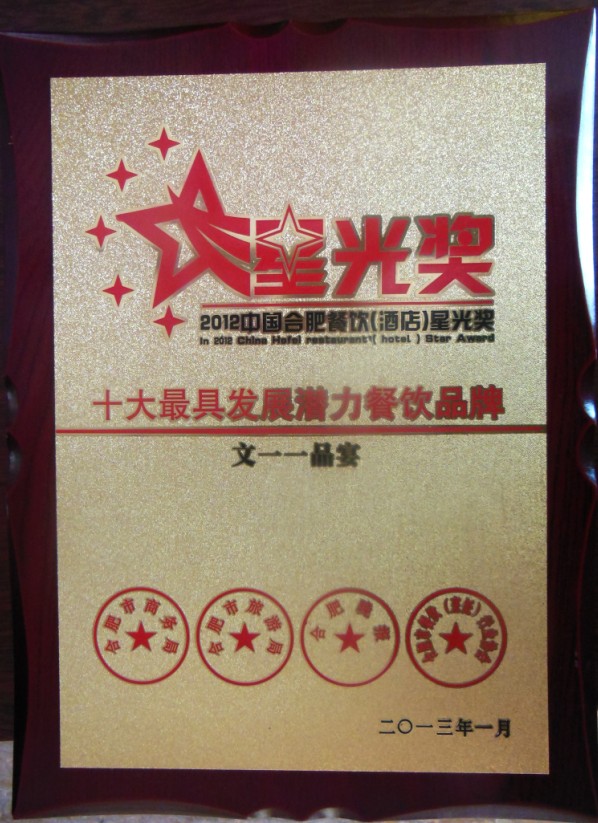 1月28日举办的“2012中国合肥餐饮“星光奖”颁奖盛典上,文一·一品宴荣获奖合肥“金筷星光奖·十大最佳发展潜力餐饮品牌”第一名。
