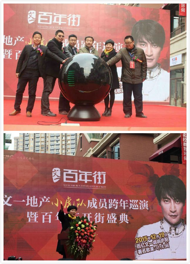 2015年12月19日上午9点58分,位于合肥市庐阳区四里河路与清源路交口的文一·百年街广场前人头攒动,来往车辆川流不息,到场逾三千人共睹本次盛会。文一·百年街开街盛典在激情四射的街舞快闪秀中热辣开启,随后文一集团副总裁、文一房地产集团副董事长薛英姿女士上台致辞,对到场的各位百年街签约及意向商家、业主及准业主、歌迷及观众朋友们表示热烈的欢迎以及衷心的感谢!