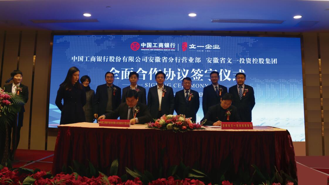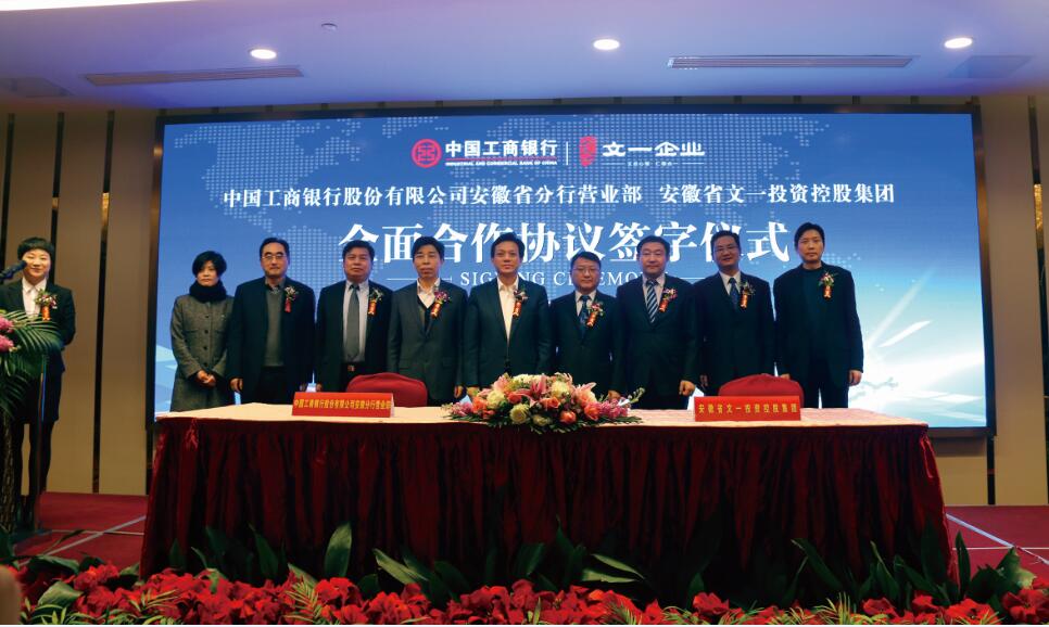 2016年1月22日,安徽省文一投资控股集团与中国工商银行安徽省分行营业部全面合作签约仪式在文一戴斯大饭店隆重举行。工商银行省行副行长、营业部总经理赵洪亚,营业部副总经理许民,营业部副总经理张跃国以及分行代表,安徽省文一投资控股集团董事长周文育、副董事长周文、副总裁陈忠等领导出席了签约仪式。文一集团副总裁陈忠、工商银行安徽省分行营业部副总经理张跃国分别代表双方签署合作协议,仪式由文一集团副总裁薛英姿主持。