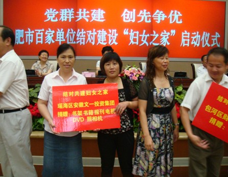 为纪念中国共产党成立90周年,贯彻落实市委组织部、市妇联《关于加强“党建带妇建”工作的意见》、《关于贯彻落实省委组织部、省妇联(关于在党群共建创先争优活动中建设村、社区妇女之家的实施意见)的通知》文件精神,进一步推动“党建带妇建”工作,切实做好“妇女之家” 活动,市委组织部、市妇联于6月22日上午9点在政务区会务中心二楼会议室联合举行结对共建“妇女之家”启动仪式,安徽文一投资集团党支部书记朱红敏作为结对单位出席了会议。