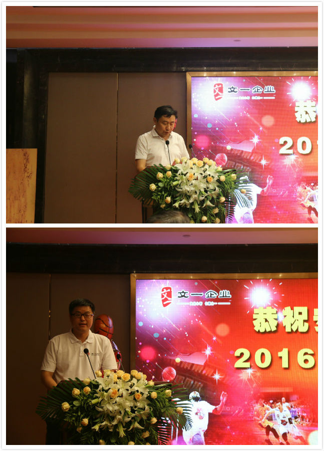 宴会开始,集团副董事长、常务副总裁周文发表致辞:在本赛季中,文一男篮历经近百天共40场激烈的角逐,最终斩获冠军。作为一支年轻的队伍,文一男篮在去年首次参加NBL联赛便取得了亚军的好成绩,进步的脚步从未停止,这一年,所有球员们付出了太多的努力,经历了太多的艰辛。在今天,这个优秀的团队为文一篮球俱乐部、为文一集团,乃至为安徽省体育事业创造了新的历史,谱写了华丽的乐章!文一男篮再一次为安徽职业篮球带来了荣耀,为安徽体育事业的发展带来新的希望,这也更加坚定了文一集团将安徽职业篮球发扬光大的信心。