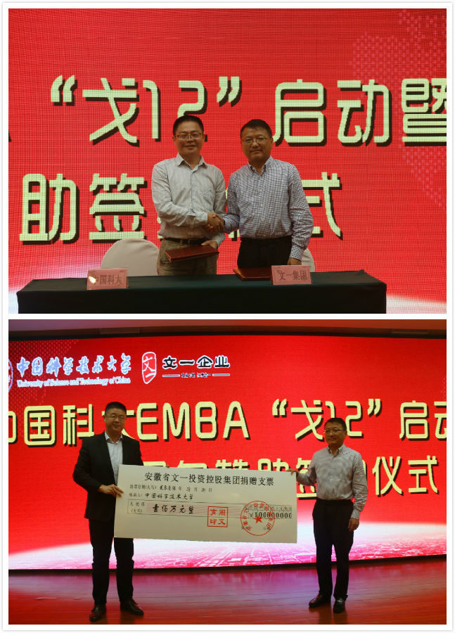 10月8日上午,中国科学技术大学 EMBA“戈十二”启动暨文一集团冠名赞助签约仪式在铜陵路一品宴隆重举行,文一集团向中国科大EMBA “戈十二”活动赞助人民币100万元。中国科大副校长周先意、中国科大管理学院院长余玉刚、文一集团董事长周文育以及中国科大EMBA成员、各大主流媒体等出席。