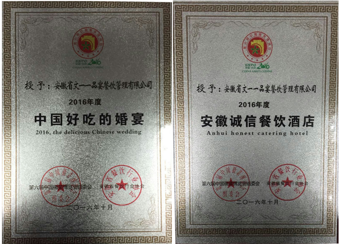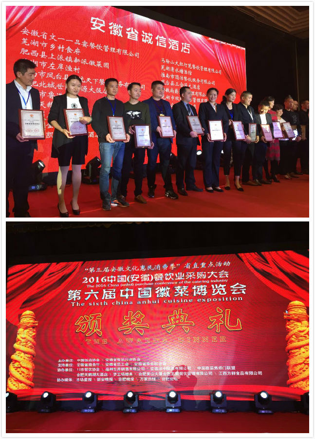 10月20日,第六届中国徽菜博览会颁奖晚会在天鹅湖大酒店隆重举行,作为此次第六届中国徽菜博览会的压轴大戏,颁奖盛典可谓精彩纷呈,奖项设置科目丰富、创意独特,2个小时的颁奖活动,让众多酒店喜获丰收,荣耀而归。其中一品宴铜陵路店凭借超强的实力,荣获了“安徽省诚信餐饮酒店”、“中国好吃的婚宴”两项大奖,而酒店总经理郝安丽更凭借出色的管理,收获了”2016年安徽餐饮杰出管理者”大奖,三项大奖的“收入”,让一品宴成为本届博览会的大赢家。