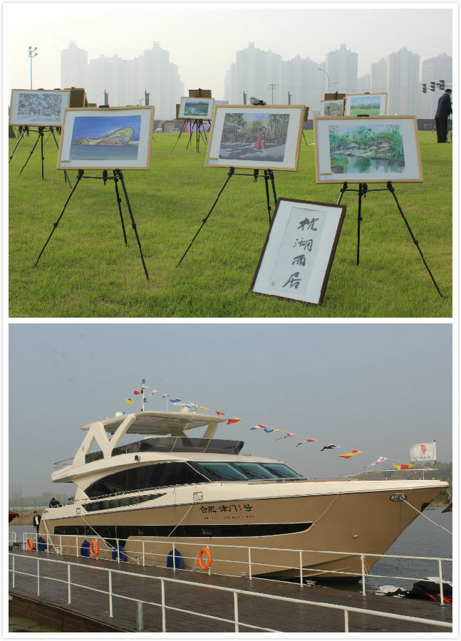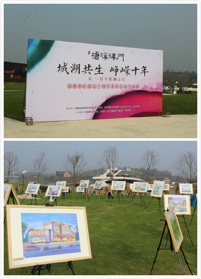 滨湖会展中心、塘西河雪景、巢湖岸边极具安徽元素的凤阳花鼓建筑、滨湖湿地公园、滨湖仿福建土楼建筑……等,所有代表着滨湖十年嬗变的景色,都变成了一幅幅水彩画,镌刻在津门艺术馆。