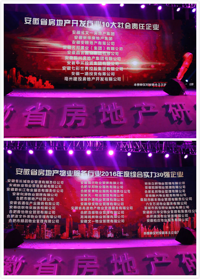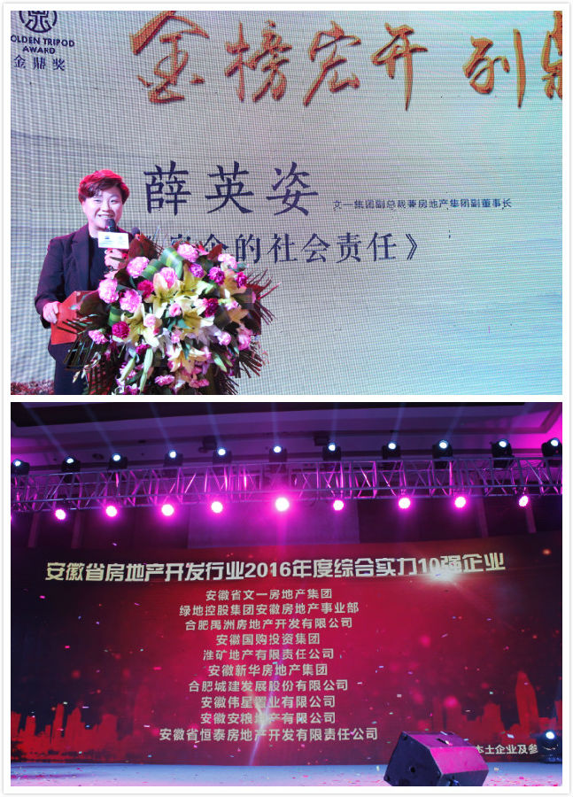 金榜宏开,列鼎江淮。 12月29日,“2017年安徽省房地产市场形势分析会暨金鼎奖2016年度安徽地产50强榜单发布会”在合肥隆重召开,文一集团董事长周文育获得安徽省房地产开发企业10大领军人物荣誉称号;文一地产位列安徽省房地产开发行业2016年度综合实力10强企业榜首、10大社会责任企业第一;文一物业获得安徽省房地产服务行业2016年度综合实力30强企业。