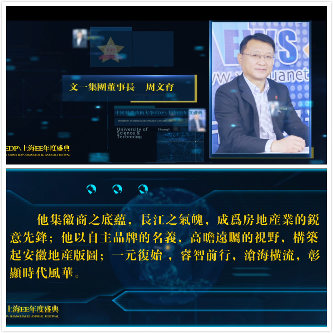 在此次盛典中,文一集团董事长周文育作为首届科大EMBA学员,荣获第三届中科大管理学院EDP年度领军人物称号,在组委会授予周董的颁奖词中对其带领文一成为安徽省房地产行业锐意先锋给予了高度评价。
