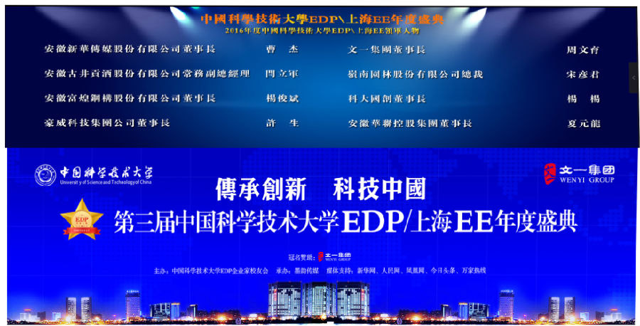 1月10日下午,“传承创新 科技中国”第三届中国科学技术大学EDP/上海EE年度盛典暨2017新春年会炫丽开启,中科大EDP班的各届校友、师生员工、以及各界精英等共同出席盛典。文一集团董事长周文育被组委会选举为“第三届中科大管理学院EDP年度领军人物”。