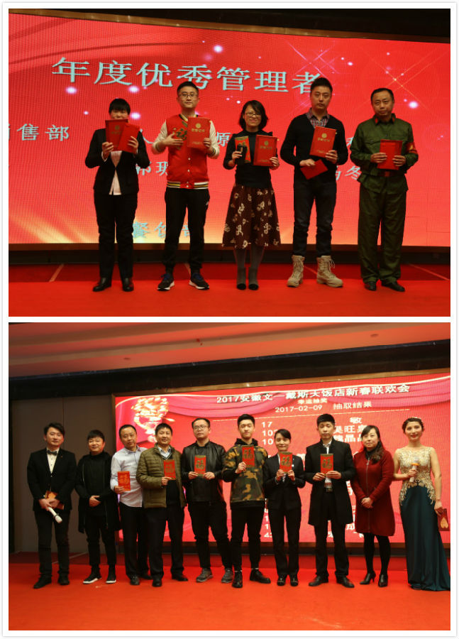 一分耕耘,一份收获。2016年,全体文一戴斯人勠力同心,兢兢业业,取得了丰硕成果和可喜成就。在春节联欢会上,酒店还进行了酒店先进集体奖金发放,并隆重表彰了2016年在各个岗位上取得突出成绩的员工及团队。现场颁发了优秀管理者、优秀员工、销售之星、服务之星、忠诚卫士等众多奖项,孙总、史总亲自为获奖员工颁发了证书和奖金。