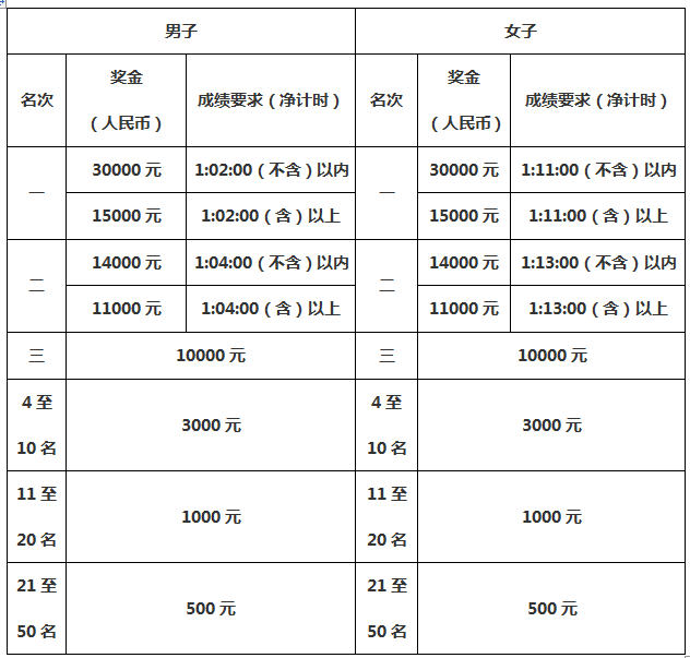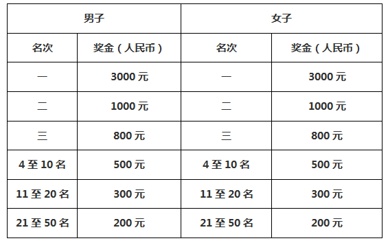 获得男、女前50名选手,分别获得奖金。(单位:人民币)