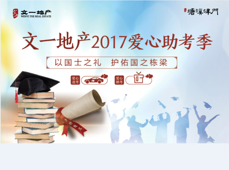 教育关乎千家万户,影响着一座城市的未来,更是城市软实力和竞争力的重要体现。6月16日,随着铃声响起,历经了三天的奋笔疾书,中考最后一场考试也正式落下帷幕。预示着“文一地产2017爱心公益助考季”礼遇国之栋梁,中高考助考活动于今日暖心落幕。作为此次公益活动发起者文一地产,再一次践行了“砖瓦精神 贡献社会”企业理念,奉献自己的力量。