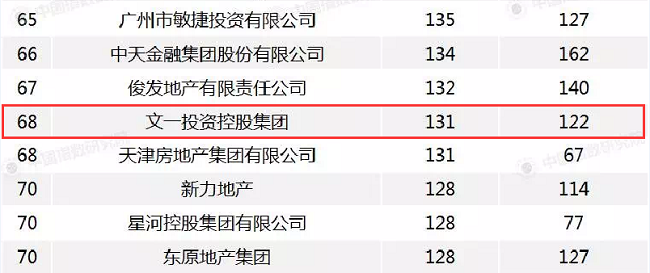 6月30日晚,中国指数研究院权威发布《2017上半年品牌房企销售业绩排行榜》。根据榜单显示,文一集团以131亿元销售额、122万方销售面积跻身榜单第68位。