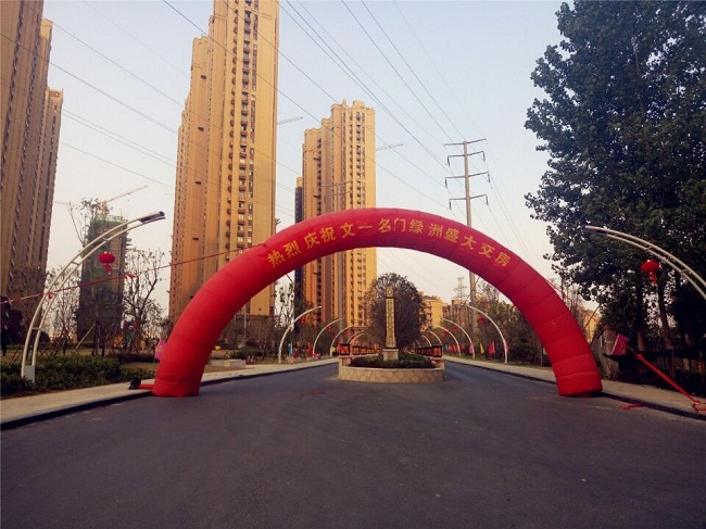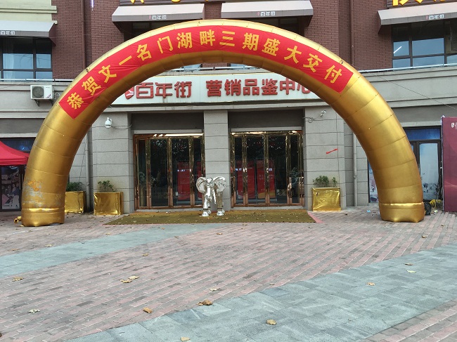 在名门湖语小区交房当天,工作人员已经提前布置好了标注有“恭祝文一名门湖语首期盛大交房”、“集结幸福 欢迎回家”等字样的彩虹门和桁架。将现场布置的一派喜气,用心迎接业主们回家。