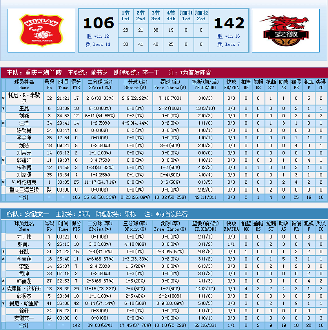 数据方面,哈里斯(42分5个篮板)和约翰逊(29分14个篮板)组合继续发力,两人合力砍下71分19个篮板。国内球员发挥出色,张勇18分,任凯16分,李青翔11分,郭顺杰10分。