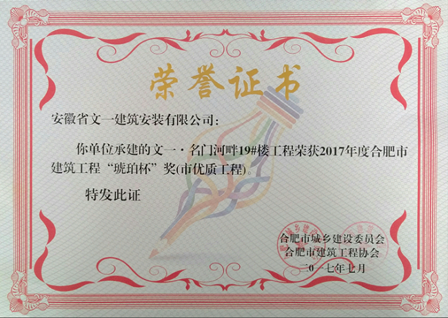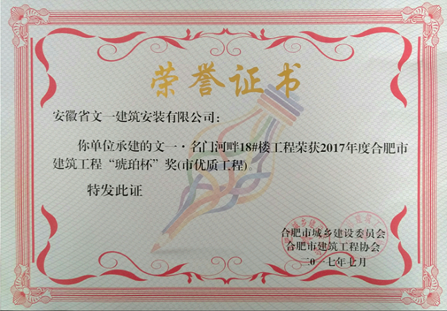 在公司领导的大力支持和统一部署下,经过紧张的申报、初评、专家组评选、网上公示等程序,由合肥建委及合肥市建筑业协会创优组审定,安徽省文一建筑安装有限公司承建的文一·名门河畔18#、19#楼工程荣获2017年度合肥市建设工程质量最高奖项——“琥珀杯”。