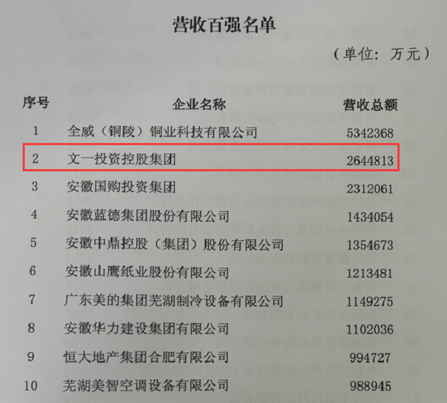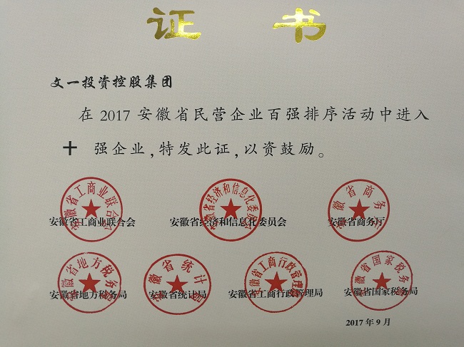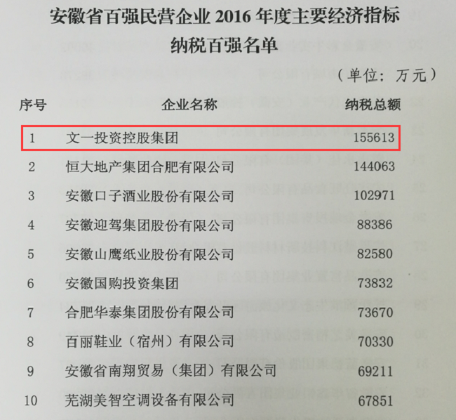 长期以来,文一集团积极践行国家发展民营经济有关政策措施,在省市各级政府的关怀下和社会各界的大力支持下,坚持一主多元发展战略,增强企业核心竞争力,建立稳固的竞争优势,从而驱动企业健康、稳定、长久发展,在“安徽省民营企业营收百强名单”上的排名稳步上升,从2013年第6位到2014年、2015年、2016年的第4位,直至2017年的第2位。纳税百强排名从去年的第3位升至第1位。