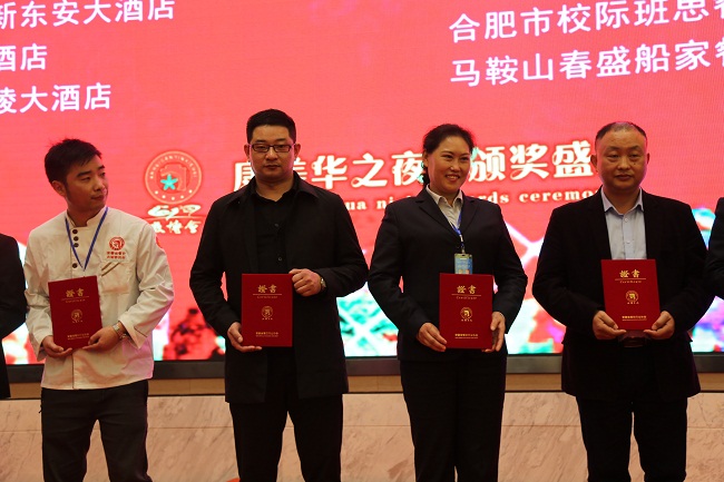 11月15日,第七届中国徽菜博览会颁奖晚会在中国书法大厦隆重举行。作为本届中国徽菜博览会的重头戏,颁奖盛典可谓精彩纷呈,奖项设置丰富、创意独特,3个小时的颁奖活动,让众多酒店喜获丰收,荣耀而归。其中,文一·一品宴铜陵路店凭借超强的实力,荣获全国酒家酒店等级评定委员会颁发的“国家四钻级酒家”,并获“博览会最佳宴席奖”、“十佳宴席品牌”、“优秀正餐品牌”三项大奖,同时酒店总经理郝安丽个人荣获“服务金匠奖”。文一餐饮旗下另一家国际精品商务酒店戴斯大饭店也同获“优秀正餐品牌”、“优秀喜宴品牌”两项大奖。七项大奖的“收入”,使得文一餐饮成为本届徽菜博览会的大赢家。