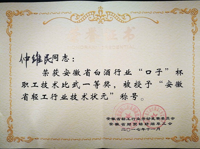 近日,包河酒业组织代表队参加由安徽省财贸轻纺烟草工会和安徽省轻工行业劳动竞赛委员会组织的“安徽省白酒行业职工技术比武”大赛。在此次酿酒技术比武中,包河酒业代表队沉着应战,奋力拼搏,最终获得团体第六名,酒业员工仲维民同志荣获安徽省白酒行业酿酒技术比武一等奖,并被授予“安徽省轻工行业技术状元”称号,包河酒业被授予“安徽省白酒行业职工技术比武优胜单位”荣誉称号。