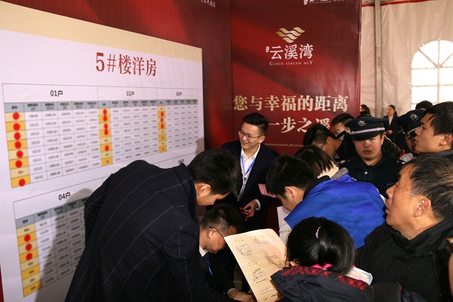 早上7点起,文一·云溪湾营销中心开盘现场就排起了长队,客户们紧张有序地签到进入现场。开盘活动从上午8点50分持续至10点半,大家注视着大屏幕摇号,成功选房的喜悦和等候选房的焦急表情交织闪过,现场氛围高潮迭起。