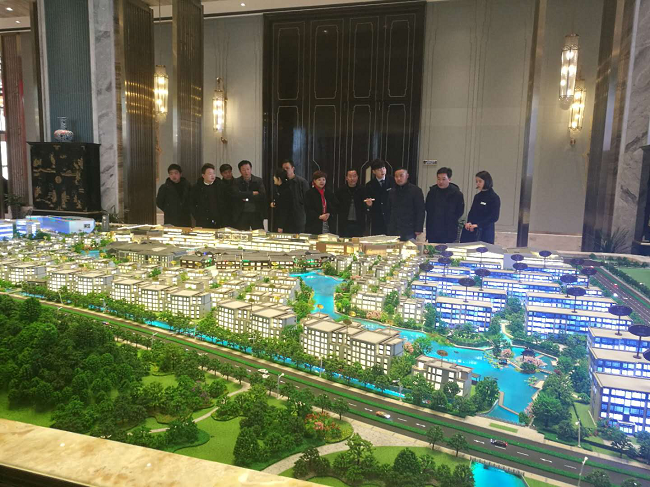 上午十点,商会领导一行抵达并稍事休息之后,文一·塘溪津门专业工作人员将大家引导至恢弘大气的沙盘,从项目的整体规划、业态分布、建筑亮点及未来打造的生活场景等,为王会长一行作了详尽的解说,让大家对于文一·塘溪津门,从外到内都有了系统深入的认识。