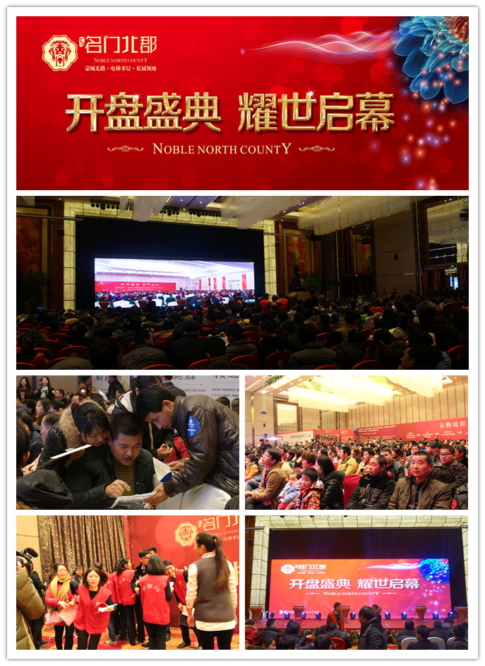 1月17日上午8点58分,文一·名门北郡于北城世纪金源大酒店举行了盛大的开盘仪式,现场气氛热烈、人气爆棚!一楼宴会厅内门庭若市、座无虚席。从上午9:00到10:30,开盘仅1.5小时,销控表上一片飘红,轻松创造热销佳绩,充分彰显了文一·名门北郡巨大的人居价值!