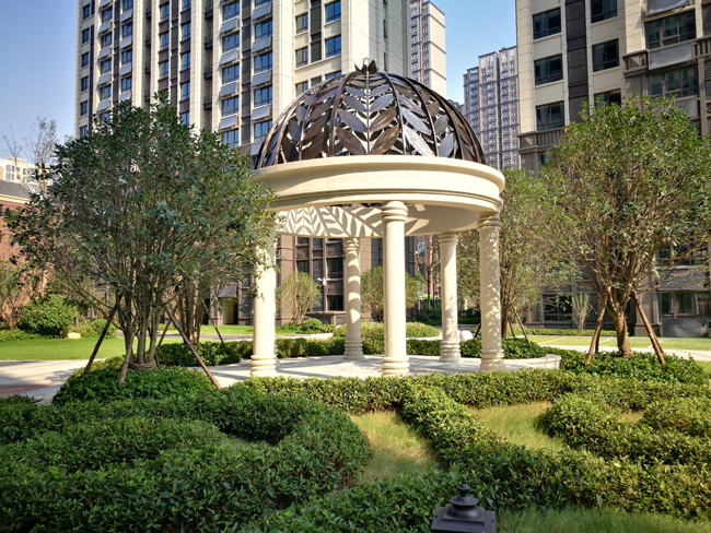 社区园林依托一横一纵两条主轴延伸,与ARTDECO风格建筑群相得益彰,乔木与花卉组成的树阵与花阵,自社区主入口轴线渐次铺陈。错落有序的视觉层次,过渡行进间的视野,高端的美学设计,感受扑面而来的归家仪式感。丰富花卉品类,带来淡雅的精致感,花阵与树阵形成五重绿化景观,随着四季与四时变幻,呈现不同景致,中心经典布置均匀分布于三个区域,两大区域均设置综合活动空间。园林中央,矗立着古铜色镂空穹顶的凉亭,一幅欧式庄园气质的画面缓缓铺开。古铜色的雕塑、欧式窗棱的照明,或静谧、或灵动的造型,典雅风姿倾泻而出。洋房区中心与高层区中心,延轴线两侧对称分布,业主可以自由选择散步的区域。洋房区以主题花园为特色,呈现精美欧式古典院落的景象。高层区以丰富景观点缀,运动设施、长廊、绿地,营造社区温馨社交平台,蜿蜒的步道、富于情趣的小品,错落的绿植,与Art-deco风格建筑群相映成趣。