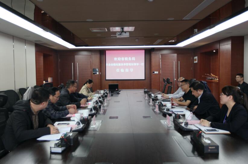 11月5日,安徽省税务局大企业税收服务和管理局局长李长富,副局长卞加林、唐安生等一行莅临集团考察指导工作。集团董事长周文育,副董事长、常务副总裁周文,财务总监、财务管理部总经理何岩松等接待并参加座谈。