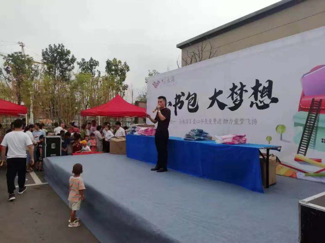 当天虽然天气十分炎热,但也挡不住工作人员送书包的热情,文一·云水湾的营销总监张华丽上台为小朋友们发放书包,她表示孩子是祖国的花朵,未来更是社会的栋梁,企业在发展的过程中更应该不忘社会责任,为祖国下一代的教育,奉献一份力量。