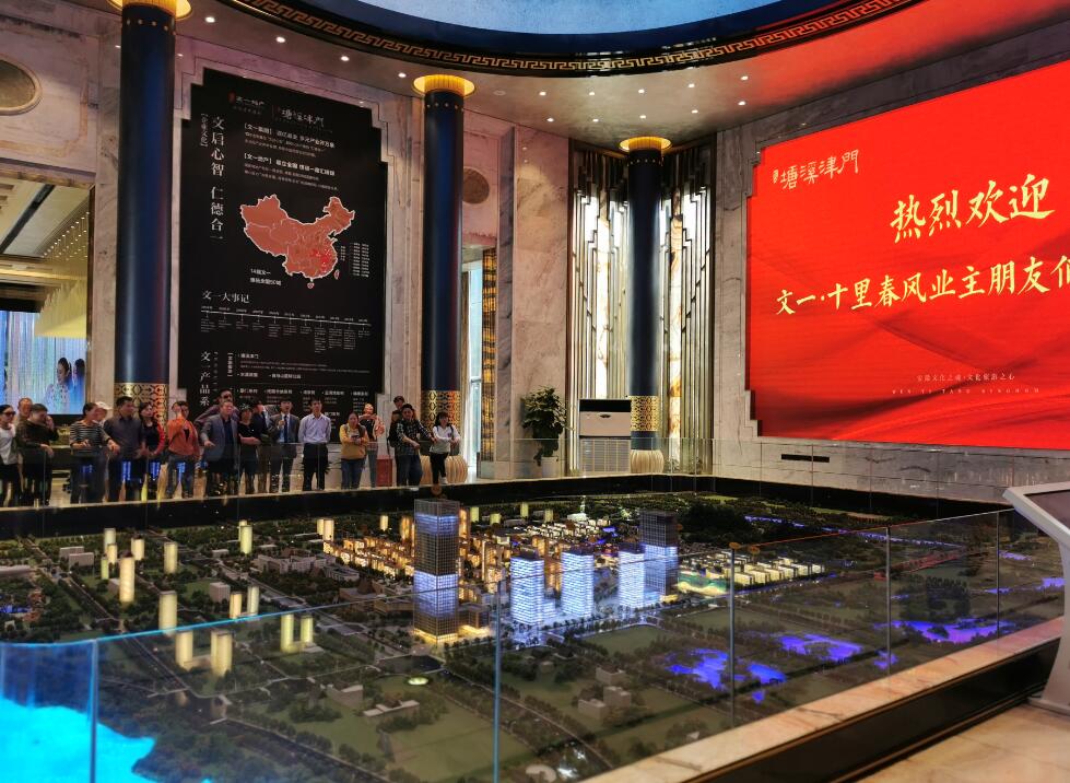 经过短暂的用餐和休息后,参观团一行驱车来到了文一·塘溪津门。文一地产是中国房地产百强企业,首个文旅项目——文一·塘溪津门将徽州历史风情,庐州人的文化记忆与现代品质生活、文化旅游有机融合,形成集徽派情怀、城市梦想与文化特色于一身的高端人居典范,让文一·十里春风的业主们如在画中行,也如同回到诗意栖居的家中。