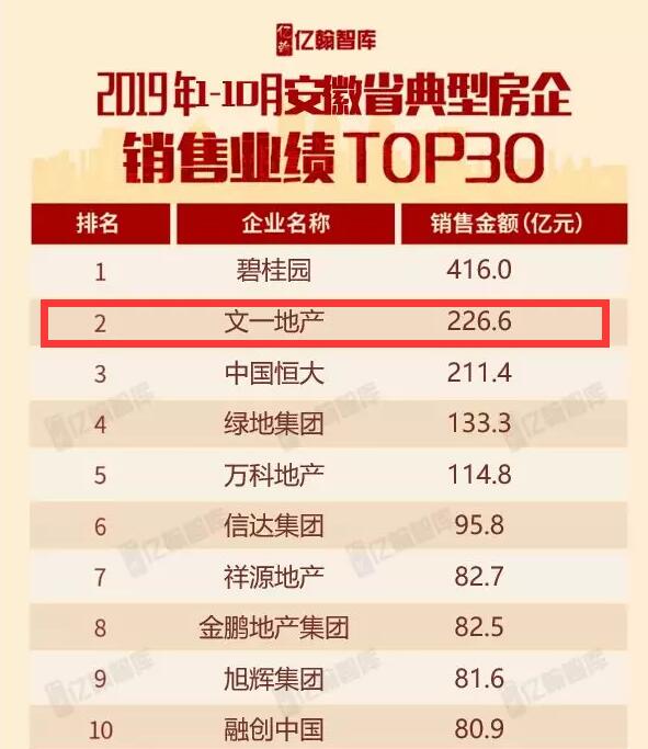 11月4日晚,亿翰智库重磅发布《2019年1-10月安徽省典型房企销售业绩TOP30》,文一地产以226.6亿元销售额名列第二位。另据10月31日晚,中国指数研究院权威发布的《2019年1-10月中国房地产企业销售业绩TOP100》榜单显示,文一地产以248.4亿元名列销售额排行榜第86位,以197.6万㎡名列销售面积排行榜第81位,居安徽首位。