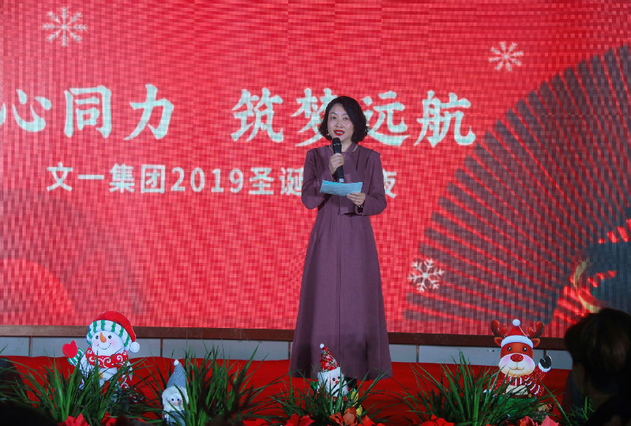 晚会伊始,文一集团党委书记、纪委书记韦存华登台致辞,首先向在座文一同仁和家属朋友们传达了周文育董事长的祝福与感谢,并表示,集团自成立以来,始终高度重视企业文化建设,关心、关注员工身心健康发展。集团每年都会邀请员工家属一起来参加圣诞晚会,就是希望通过这个亲友团聚的节日,让大家放松身心,享受美好时光,也相信所有同仁们未来依然能一路同行,长歌万里。