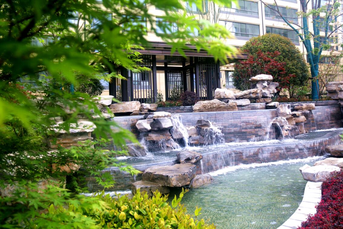 下午三点,在置业顾问的陪同下,大城通过体温检测进入小区,入眼即是园区中一片郁郁葱葱的绿景。碧意掩映间,亭台前漱漱流水穿过层叠的山石,倾泻一片诗意画境。大城与景观设计师杨工交流得知,假山全部选材太湖石,取中式园林的神韵造景。一旁造型奇特罗汉松巍巍而立,花坛中由花卉拼出的“文一”二字,更是独具巧思。往前再走几步,见一小池塘中莲叶舒展,鱼游浅底,隐隐可见池塘底部鱼鳞形状的花纹。