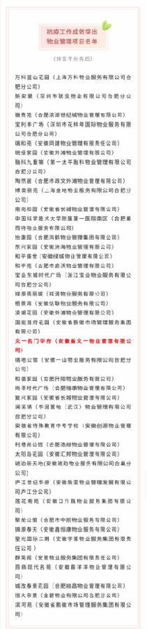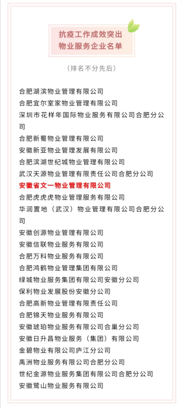 6月24日上午9点,合肥市住房保障和房地产管理局召开合肥市深化党建引领全面提升物业工作水平会议,会上对抗疫工作成效突出的24家物业企业、40个物业管理项目、40名物业工作者进行奖励通报。其中安徽省文一物业管理有限公司被授予“抗疫工作成效突出物业服务企业”荣誉称号,文一·名门华府小区和项目经理葛春芳分别获得“抗疫工作成效突出物业管理项目”和“抗疫工作成效突出物业工作者”荣誉称号。