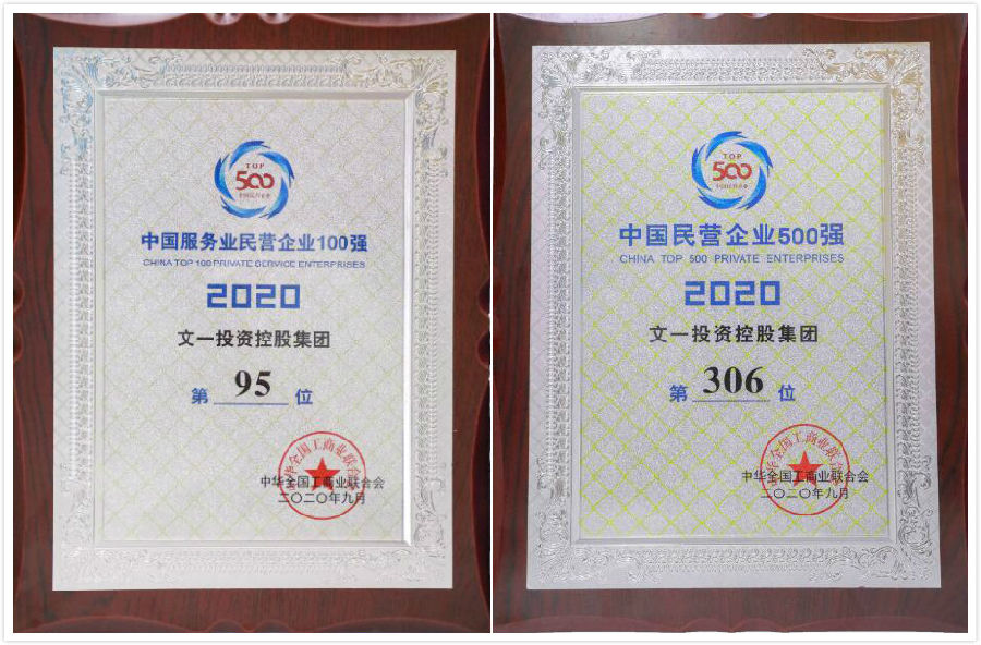 9月10日,2020中国民营企业500强峰会隆重召开。会上,全国工商联发布了2020中国民营企业500强、制造业500强、服务业100强榜单及分析报告。榜单显示,今年安徽省共4家企业荣登民营企业500强榜单,较之去年新增2家。文一投资控股集团荣登2020中国民营企业500强榜单排名第306位,连续三年位居上榜皖企之首,且在中国民营企业服务业百强榜单中排名第95位,成为安徽唯一入榜企业。